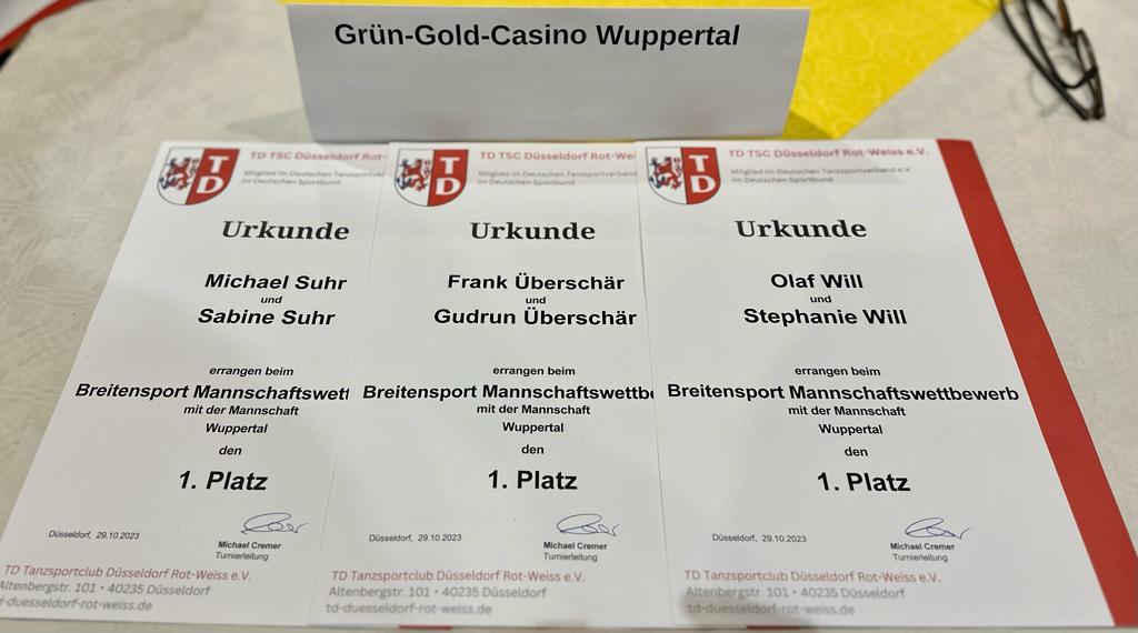 Längere Zeit hatte sie nicht mehr an einem Wettbewerb teilgenommen, aber es waren drei der erfahrensten Paare, die als Mannschaft in Düsseldorf antraten. Mit Freude stellte unsere Abordnung fest, dass eine Mannschaft des Grün-Gold Casino Wuppertal immer noch bekannt und geachtet ist.